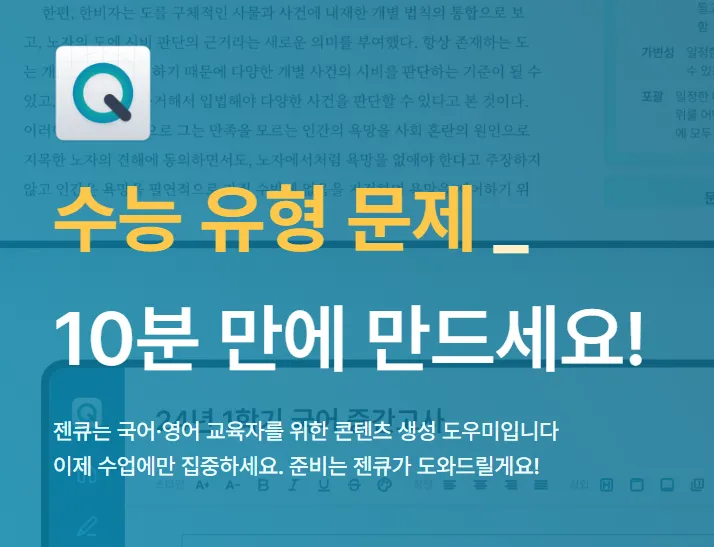 국어 및 영어 지문 그리고 문제를 자동으로 만들어주는 젠큐는 생성형 AI 서비스로 학생 및 선생님들이 자유롭게 이용할 수 있다. 특히 영어뿐만 아니라 국어까지 서비스 대상에 추가하고 서울교육청에 공급하면서 공교육까지 지원하고 있다.