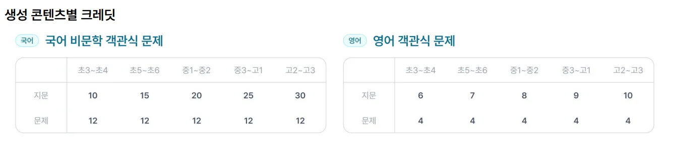 이때 문제를 생성할 시에는 학년에 무관하게 동일한 크레딧량이 소모되며, 지문 생성 시에만 학년이 높아질수록 소요되는 크레딧량이 증가한다. 더불어 영어 객관식 문제 생성 보다는 국어 비문학 객관식 문제 생성 시 더 많은 크레딧을 요구한다.